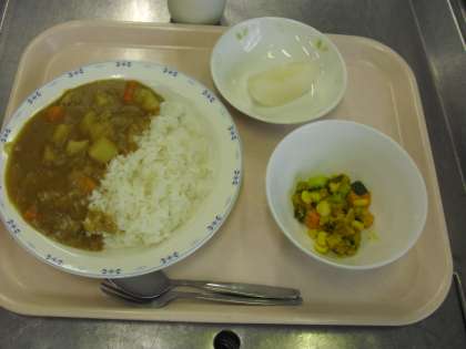 カレーライス 牛乳 パンプキンサラダ くだもの