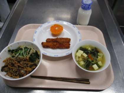 ビビンバ 牛乳 わかめスープ いかのカリント揚げ