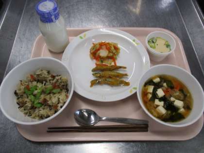 五目ごはん 牛乳 魚のカレー揚げ 白菜のおかかかけ