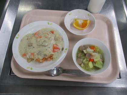 チキンドリア 牛乳 キャベツとウインナーのスープ