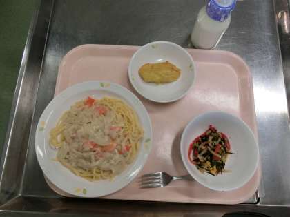 スパゲティークリームソース 牛乳 大根とひじきのサラダ