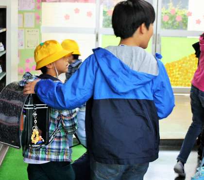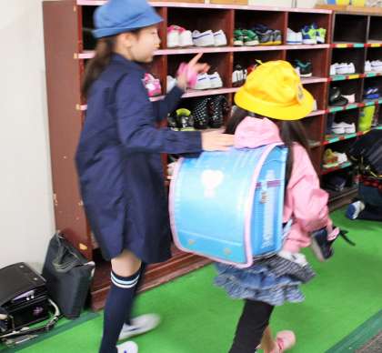 1年生は入学したばかりでわからないことがいっぱいです。そんな不安を6年生がやさしくフォローしてくれています。さすが砧小学校の最高学年の6年生です。
