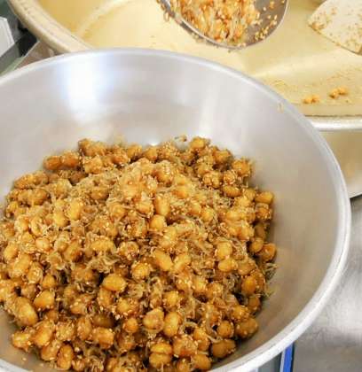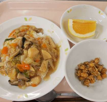 今日の給食の副菜は、大豆とじゃこの甘辛揚げです。今日もおいしく出来上がりました。