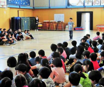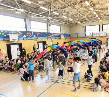 今日は1年生を迎える会です。1年生と6年生が手をつないでの入場です。1年生は上級生の子どもたちの人数の多さに、少し緊張した面持ちでした。