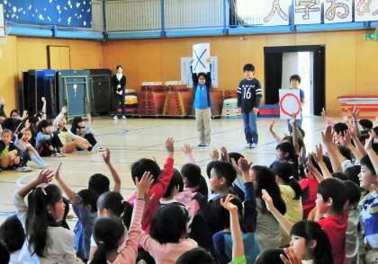 まずはじめに、代表委員の子どもたちによる歓迎の呼びかけや先生紹介、そして砧小クイズです。「早く砧小学校に慣れてください。わからないことがあったら何でも聞いてください!」といった優しい言葉がたくさんあり、1年生の緊張もだいぶ和らいできました。