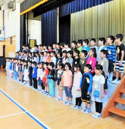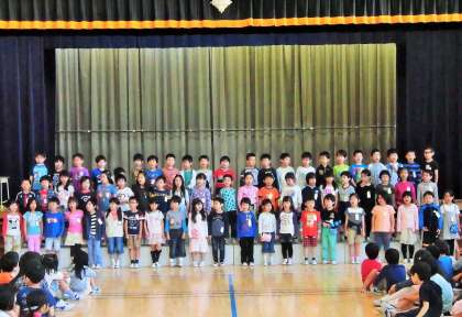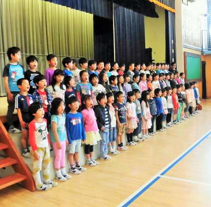 今度は1年生の出番です。お礼の気持ちを込めた呼びかけと、「にじ」の歌を、元気よく楽しそうに歌っていました。これで、全校児童の仲間入りです。