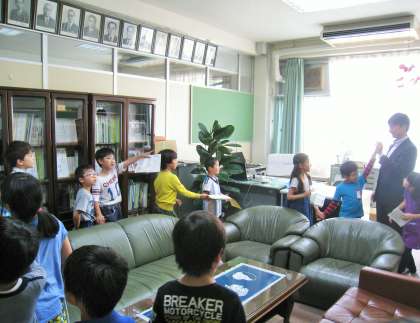 今日は2年生が、お兄さん、お姉さんとなり、1年生を学校探検(学校案内)に連れて歩きました。1年生と手をつないで、校長室、主事室、図書室など、校舎案内図を手にし、それぞれの場所で案内をしました。「ここが校長室で、校長先生がお仕事をしています」などと、わかりやすく説明をしていました。2年生が良きお手本となって、入室するときには「失礼します」、出口では「ありがとうございました!」と大きな声であいさつをしているので、1年生にもとってもよい学習となりました。2年生ありがとう!