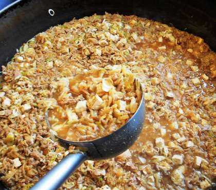 今日の給食の<豚丼>には、豚肉とたくさんの野菜をつかい、やさしい味に仕上がりました。