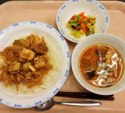 給食の<豚丼>には、玉ねぎもねぎもはいっています。