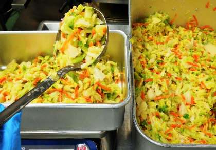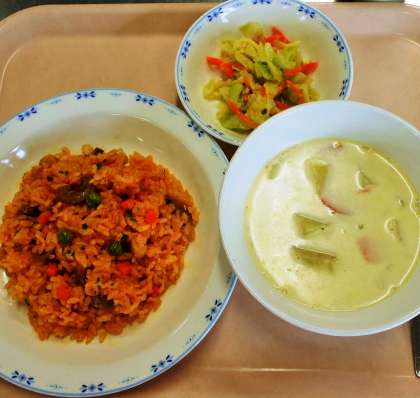 今日の給食の副菜は、<キャベツサラダ>です。今が一番おいしい時季である春キャベツをたっぷり使いました。