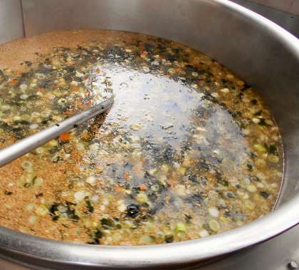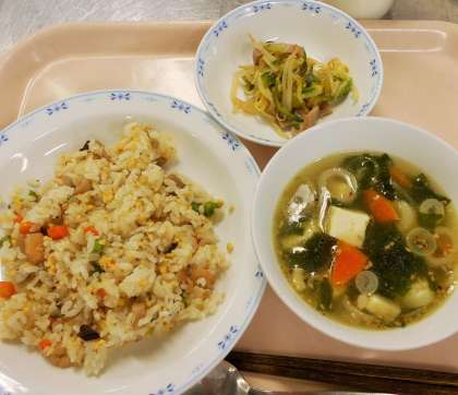 <わかめスープ>の中にはいっている[わかめ]には、おなかの掃除をしてくれる食物せんいや、骨や歯をじょうぶにしてくれるカルシウムがたくさんはいっています。給食では、スープやごはん、サラダなどに、積極的に使用しています。ぜひ、子どもたちに好きになってもらえたらと思っています。