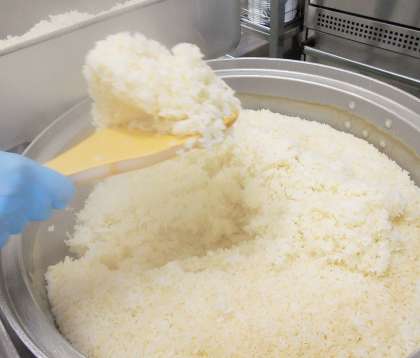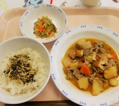 今日の給食の主食は、[麦ごはん]です。お米には、考える力や体を動かす力など、エネルギーのもとになる炭水化物が含まれています。他にも、体をつくるたんぱく質や、おなかの調子をととのえる食物せんいなどが含まれており、子どもたちが元気に過ごすために大切な食品です。