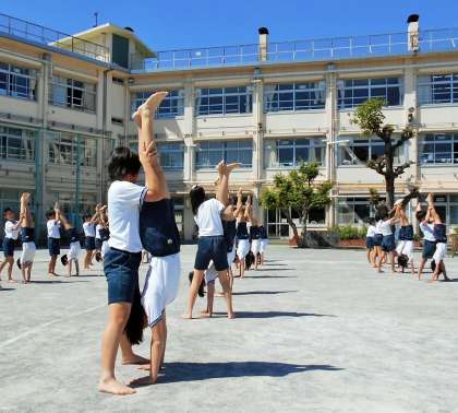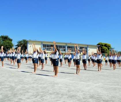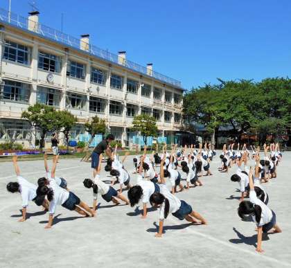 5・6年生の「組体操」は、子どもも教師も真剣です。手の指先、足のつま先までぴんと伸ばした姿勢を大切に、「美しい」組体操を目指しています。常に安全を第一に考え、「怪我ゼロ」を合言葉に集中して取り組んでいきます。