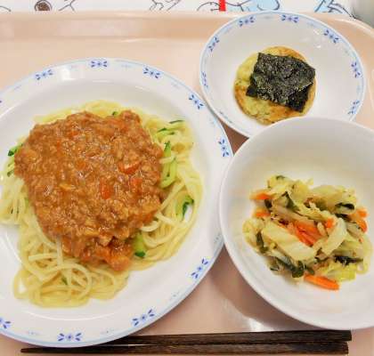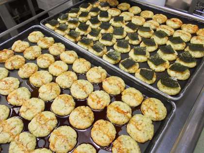 今日の給食の副菜は、[じゃがいももち]です。じゃがいもを蒸してつぶし、熱いうちに青のりと片栗粉をまぜ、丁寧に形を整えてオーブンで焼きました。焼きあがったら、しょうゆと焼きのりをつけて完成です。教室をまわってみると、「のりが好きだから、先に食べたよ。」「食べてみたら、じゃがいもの味がしておいしかった。」と話してくれました。