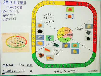 今日は、給食時間内に保健給食委員のみなさんが各教室をまわり、ハンカチとティッシュを持ってきているか調査してくれました。1階給食室前にある給食用のホワイトボードに、食べものの3つのはたらきについての分類も毎日してくれます。きらきらとした表情で仕事をしてくれるので、とても嬉しく思います。