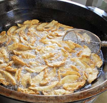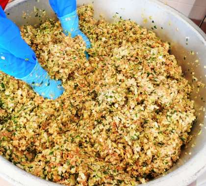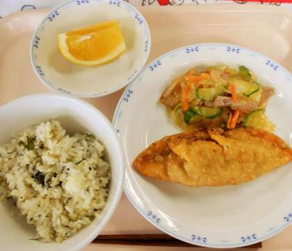 今日の給食の主菜は、[ジャンボぎょうざ]です。給食の[ジャンボぎょうざ]は、調理員の方が具を練り、ひとつひとつ包んで油で揚げて作ります。キャベツやにらなどの野菜と豚肉がたくさん入っていて、栄養満点です。