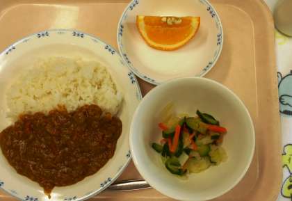 今日の給食は、[キーマカレーライス]です。ひき肉をつかったカレーを[キーマカレーライス]といいます。たくさんの種類の野菜をみじん切りにして加え、ルーも手作りし、おいしくなるように愛情もたくさんこめて作りました。