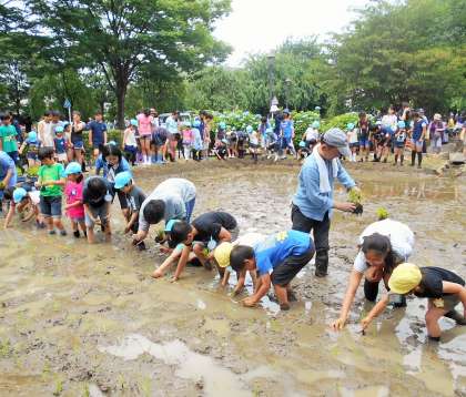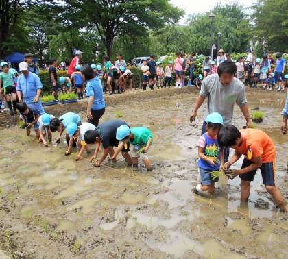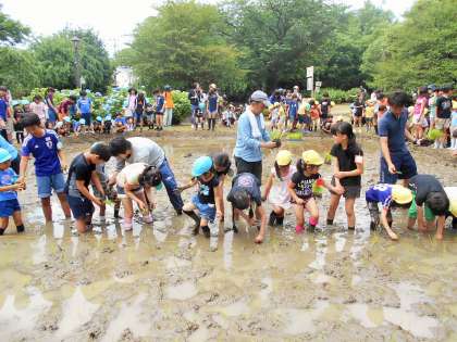 幼稚園のお友達の手を引きすぎず、自分の足元も確保しつつ、小さい子の足場を確認しながらの田植です。また一つ、砧小学校のリーダーとして素敵な姿を見ることができました。秋の稲刈り、さらには餅つきが楽しみです。