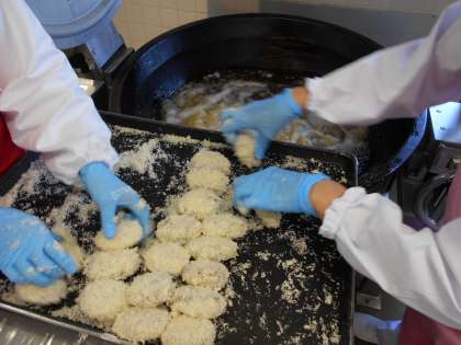 今日の給食の主菜は、[たこコロッケ]です。子どもたちの好きなコロッケの中に、たこ・青のり・かつおぶしを加えました。