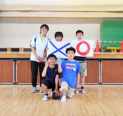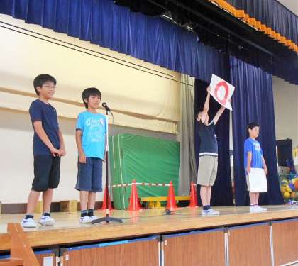 今朝の児童集会は集会委員会による学校物知りクイズです。集会委員の子どもたちが、学校に関するクイズを出して、○×で答えます。クイズに当たった子どもたちは、全身で喜びを表していました。