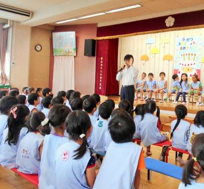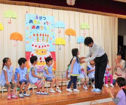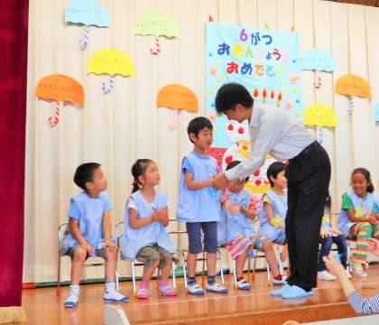 今日は砧幼稚園6月のお誕生日会です。私からの首飾り、先生からのカード、お友達から歌やクイズのプレゼントでお祝いをしました。