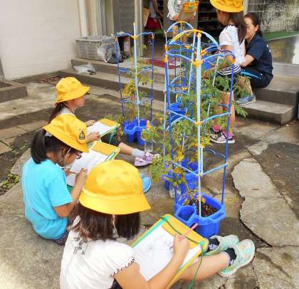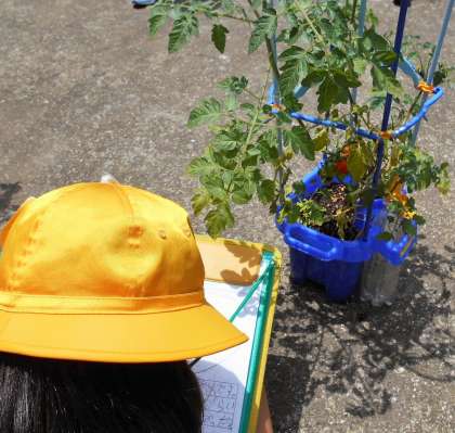 今日は2年生が、生活科で大切に育てているミニトマトの観察です。今日はどのくらいの大きさに育っているのか・・・手でさわり、葉の様子やミニトマトの数を数えて報告してくれました。