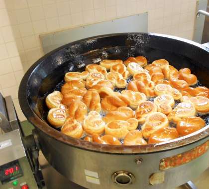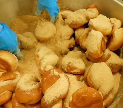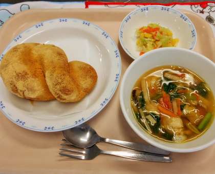 今日の給食は、砧小の人気メニューの[きなこ揚げパン]です。[きなこ揚げパン]のきなこには、からいりして香ばしい香りのきなこに、砂糖と少しだけ塩を加えています。塩を加えることにより、甘さがひきたつのです。