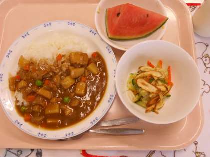 教室をまわっていると、「今日のカレーはいつものカレーよりも好き。」と言ってくれる子もいれば、「えびが苦手だから、今日のカレーは残念なカレー。」と話してくれる子もいました。ポークカレー、キーマカレー、シーフードカレー、夏野菜カレーなど、給食では具材をかえて、味の変化を楽しんでもらえるように工夫をしています。