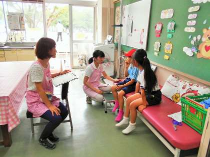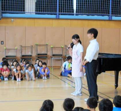 今日の音楽朝会の後、教育実習生を紹介しました。聖路加国際大学の学生で、養護教諭になろうと考えています。保健室の徳永先生のもとで、あと2週間勉強します。