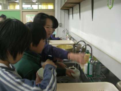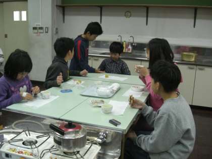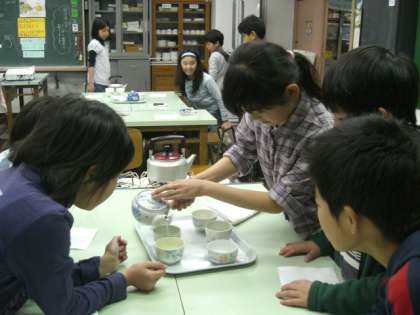 コンロを使うこと、お茶を入れること・・・経験の少ない児童も、教師の話を聞き、楽しく取り組んでいました。