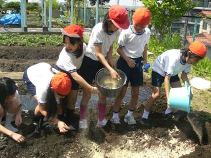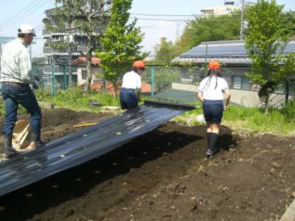次は、肥料を入れて土に栄養を与えます。さらに、マルチシートを敷き、苗を植えました。教室では、苗を見ながら今年1枚目の絵手紙を描きました。