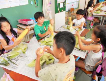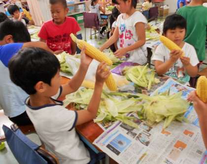給食の時間にとうもろこしを食べながら、子どもたちは嬉しそうに季節の味を楽しんでいました。