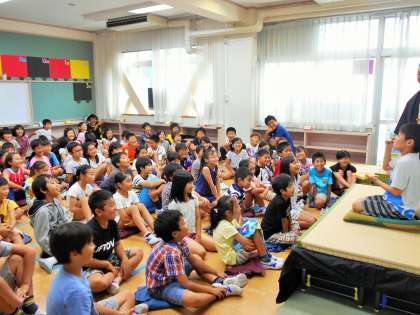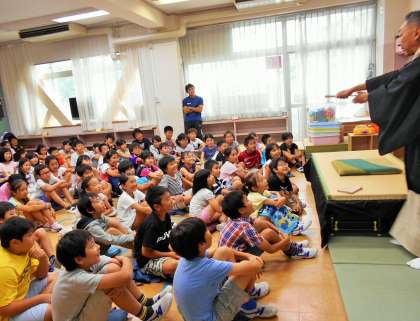 まずは、扇子を使って、そばやうどんを食べる仕草や刀を振り下ろす仕草、何も持たずにまんじゅうを食べる仕草に子どもたちは大笑いです。その後、高座に上がっていただき、落語「青菜」を見せていただきました。子どもたちは、たくさん笑い、落語の面白さを知り、とても有意義なひとときになりました。