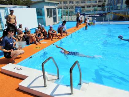 今日は、夏季水泳教室の検定日です。合計で267名の子どもたちが進級を目指して挑戦しました。「やったー!」と歓声を上げる子もいて、指導している教師にとっては、この喜びがとっても嬉しいのです。本当によくがんばりました。