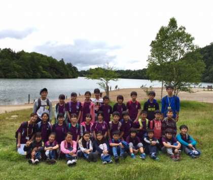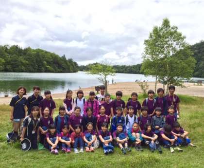 湯ノ湖です。湯ノ湖は、白根山からの水に加えて、湖畔にある湯元温泉からの湯が流れ込んでいます。静かな湖畔に6年生の声が響いています。