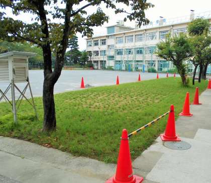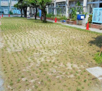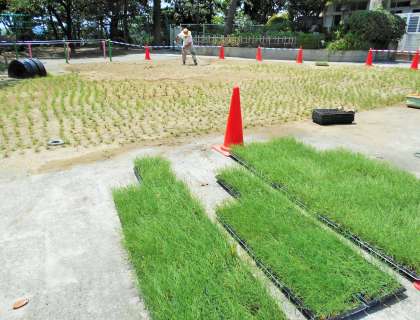 校庭の芝生の植え替えが、順調に進んでいます。芝生の生育があまり良くなかったため、土を入れ替えて西洋芝を植えました。一か月の養生期間を経て、9月から子どもたちが遊べるようになります。