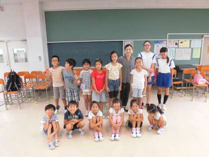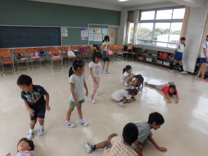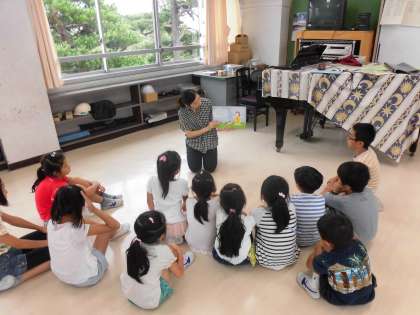 今日のサマースクールは「小学生リトミック」です。全学年を対象に行われました。講師の先生は、保護者の矢口さんです。ピアノの音に合わせて動き回ったり、頭の体操や楽器を使った音楽ゲームなどをたくさん行いました。子どもたちは夢中になって取り組み、笑顔で溢れていました。