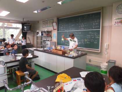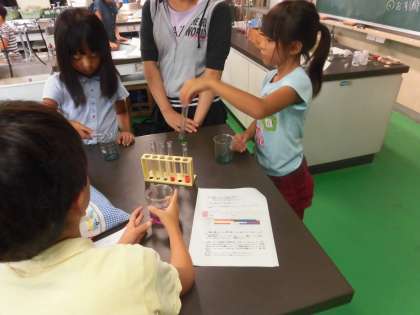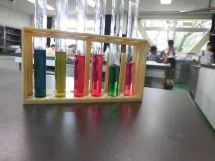 「化学実験入門」の2日目です。昨日と同じく、講師の先生は佐分利さんです。PH試験紙を使ったり、ムラサキキャベツの指示薬を使ったりして、様々な水溶液の酸性度を調べました。酸性、中性、アルカリ性といった水溶液の性質によって、色が変わっていきました。