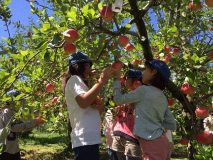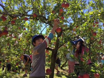 村めぐりをしています。りんご園では、りんご狩りをして、試食をさせていただき、甘くて濃厚なりんごジュースをいただきました。