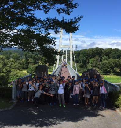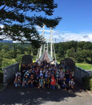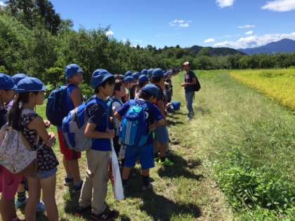 村めぐりは、担任の先生の説明を聞きながら、クラス毎にまわっています。途中の牛舎やこんにゃく畑などで見学しました。もうすぐ、田園プラザに到着します。
