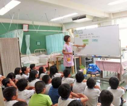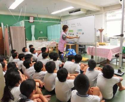 6年生には「油について」話しました。1日に必要な油の量は約50gです。スナック菓子などを食べすぎると、必要量を超えてしまうことがあるので、気をつけてほしいと思っています。