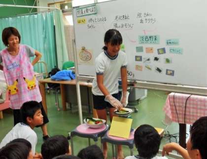 5年生の保健指導は「野菜を食べよう」という内容です。野菜の働きについて確認し、1日に約350g食べようと話しました。350gを子どもたちに予想させ、実際に野菜を量ってみました。思っていたより多い量に、「え〜、こんなに必要なんだ!」「食べてないや!」という声があがりました。