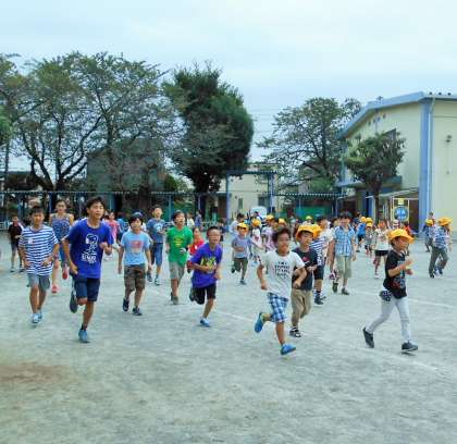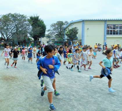 朝遊びの後は、朝のランニングです。今年度の重点目標の一つである健康・体力づくりへの取り組みです。音楽の曲に合わせて、自分のペースで距離を刻んでいる子、先生と一緒に走る子、友達と競走をしている子・・・。