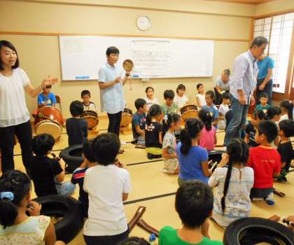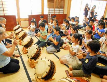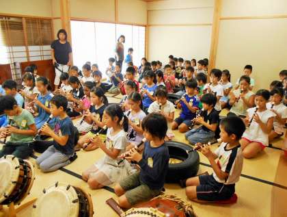 毎年、砧小学校で3年生が取り組んでいる「石井戸ばやし」の練習3回目です。石井戸ばやし保存会の方々6名に来ていただき、教えていただきました。