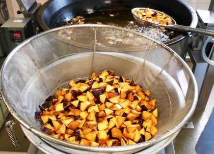 今日の給食は、[じゃこ入り大学いも]です。今日は素揚げしたちりめんじゃこを加えて、カルシウムたっぷりの大学いもにしました。