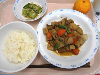 今日の給食は、旬のさといもをつかった[鶏肉と里芋のうま煮]です。教室をまわっていると、「野菜は苦手だけど、今日の煮物がおいしいです。」と話してくれる子がいました。根菜類は苦手な子どもたちも多いようですが頑張りが伝わり、とても嬉しく思います。