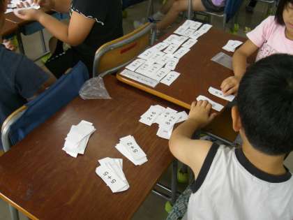 算数カードを作ってならべて数の不思議に気づいたり、カードを使ってたしざんゲームをしたりして学びを深めています。