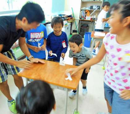 「紙コップロケット」「トントン相撲」の様子です。先生も一緒に遊んでいるので楽しさも倍増です。
