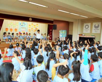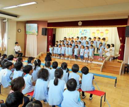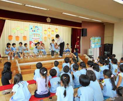 今日は砧幼稚園10月のお誕生日会です。私からのレイの首飾り、先生からのカード、お友達から歌のプレゼントでお祝いをしました。