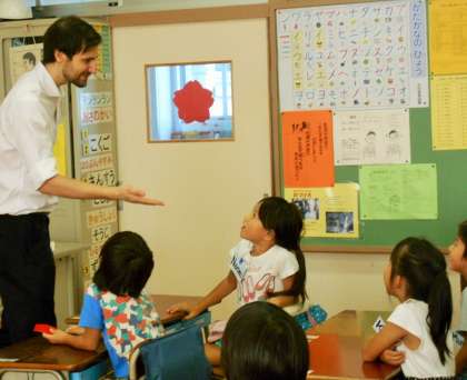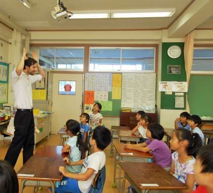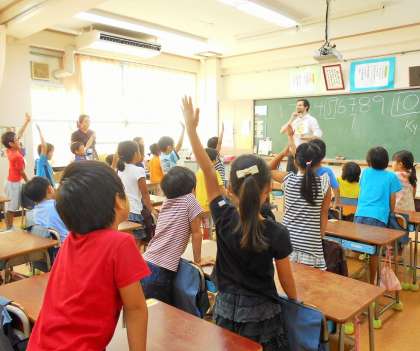 今日は1年生の英語活動です。カナダ出身のカイル先生が来てくださいました。今日は、カナダで人気の動物や食べ物を当てたり、数の言い方を練習したりして楽しく英語と親しみました。最後は、英語で伝言ゲームをしました。他の列に負けないよう、一生懸命伝えようと頑張っていました。